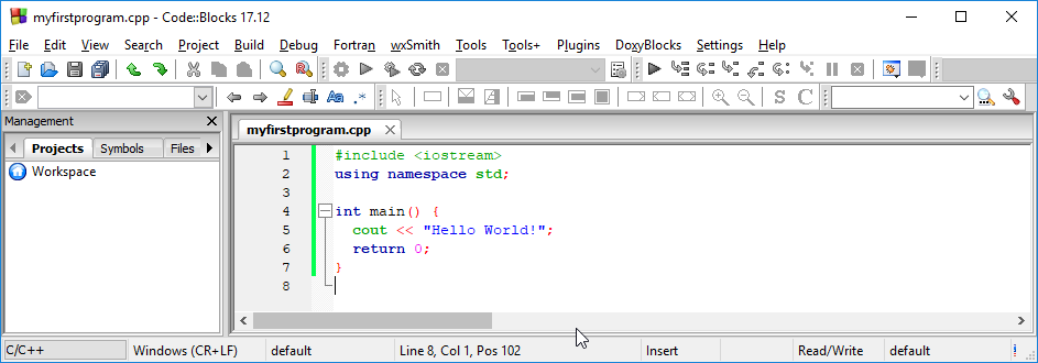 Write the following C++ code and save the file as myfirstprogram.cpp (File > Save File as):