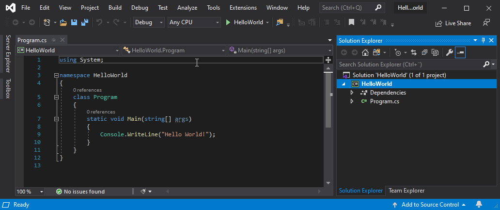 Run the program by pressing the F5 button on your keyboard (or click on "Debug" -> "Start Debugging"). This will compile and execute your code. The result will look something to this: