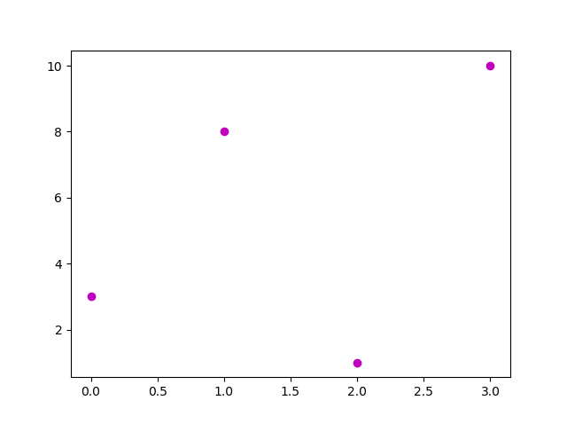 #Three lines to make our compiler able to draw: import sys import matplotlib matplotlib.use('Agg') import matplotlib.pyplot as plt import numpy as np ypoints = np.array([3, 8, 1, 10]) plt.plot(ypoints, 'om') plt.show() #Two lines to make our compiler able to draw: plt.savefig(sys.stdout.buffer) sys.stdout.flush()