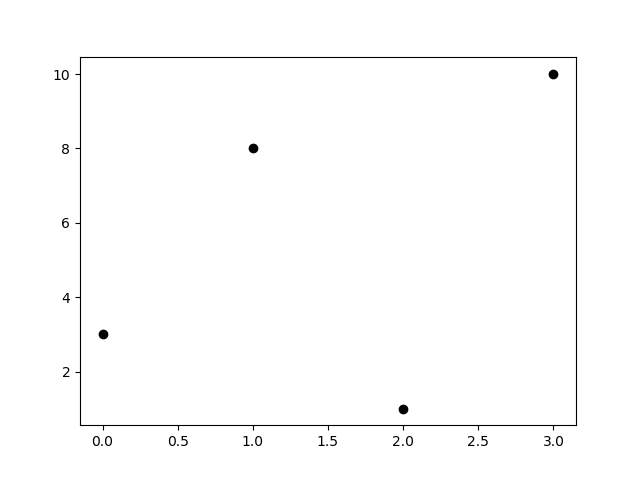 #Three lines to make our compiler able to draw: import sys import matplotlib matplotlib.use('Agg') import matplotlib.pyplot as plt import numpy as np ypoints = np.array([3, 8, 1, 10]) plt.plot(ypoints, 'ok') plt.show() #Two lines to make our compiler able to draw: plt.savefig(sys.stdout.buffer) sys.stdout.flush()