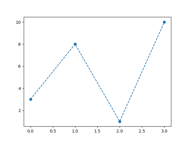 #Three lines to make our compiler able to draw: import sys import matplotlib matplotlib.use('Agg') import matplotlib.pyplot as plt import numpy as np ypoints = np.array([3, 8, 1, 10]) plt.plot(ypoints, 'o--') plt.show() #Two lines to make our compiler able to draw: plt.savefig(sys.stdout.buffer) sys.stdout.flush()