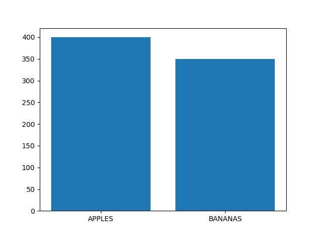 #Three lines to make our compiler able to draw: import sys import matplotlib matplotlib.use('Agg') import matplotlib.pyplot as plt import numpy as np x = ["APPLES", "BANANAS"] y = [400, 350] plt.bar(x, y) plt.show() #Two lines to make our compiler able to draw: plt.savefig(sys.stdout.buffer) sys.stdout.flush()